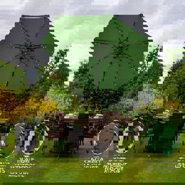 Get summer ready with this beautiful LED tilt parasol. Stylish and practical, this is a stunning addition to your garden whilst providing excellent UV protection with high quality 160g polyester. Combining traditional workmanship with modern aesthetics, this green parasol will perfectly compliment your surroundings.