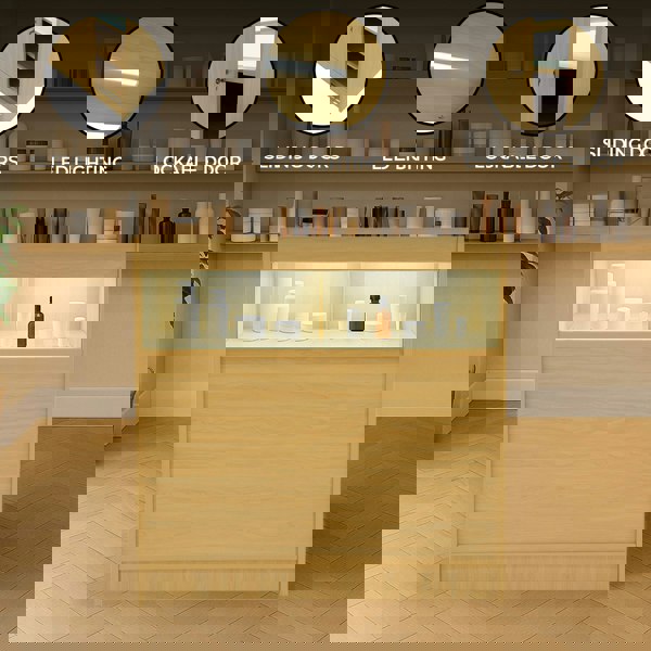 Constructed from high-quality MDF with a durable melamine finish and toughened glass panels, the B900 counter is built for lasting performance in busy commercial settings. The bright white LED lighting adds a crisp, professional glow to your display items, ensuring that products are showcased to their best advantage even in lower-light conditions. The counter’s clean maple exterior enhances its premium look, making it a refined addition to both contemporary and classic store layouts.