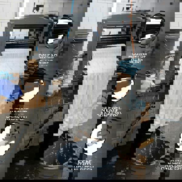 Solid carbon steel construction with a protective powder coating supports heavy-duty use, while the Nitrile Butadiene Rubber (NBR) rollers are selected for resistance to oil, grease and a wide range of chemicals. An extended wooden crank handle with a wooden grip helps maximise leverage and maintain control, keeping hands clear during operation. For easier clean-up, the integrated drainage tray guides liquids away in a smooth flow for straightforward collection and a tidier work area.