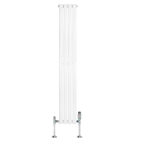Made from 1.5mm carbon steel, the 4-column design uses individual oval tubes sized 50mm x 25mm, with a 10mm gap between tubes. Heat output is rated at 1512 BTU at 50 and 1919 BTU at 60 (443W at 50 and 562W at 60). Standard 0.5" BSP inlets/outlets support compatibility with UK and EU heating systems, while the angled thermostatic valves offer rotary control with a 6–28 degrees temperature range and an integrated lock shield valve.