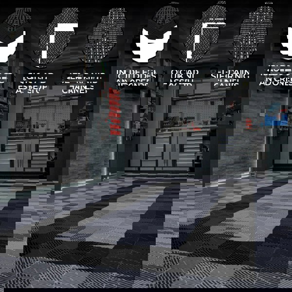 Not only is this flooring protective, but it also enhances the look of your space. The sleek grey and black tiles lend a clean, modern aesthetic that elevates any garage or workshop, making it a place you’ll be proud to show off or spend time in. Maintenance is effortless - just sweep or rinse as needed to keep your tiles looking like new.