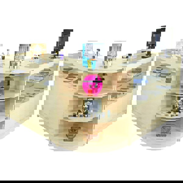 The LM60 counter is shelved corner unit designed to connect any combination of the A1200, B1200, C1200 or K1200 counters together to create a large L shaped counter set, but can also be used as a standalone unit. The curved front shows off four customer-facing levels to display your products.