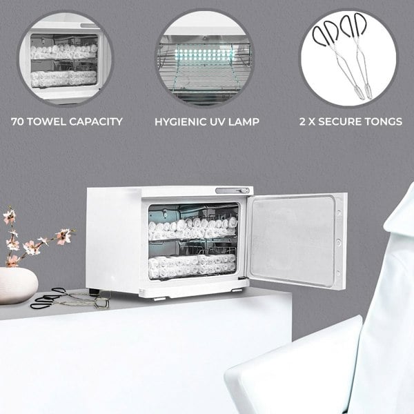 Equipped with a UV lamp for ultraviolet light, this machine has excellent disinfecting properties. Combined with the impressive 70°C heat output, you can be sure you’ll be providing your clients with sterile and deeply cleansed cloths for a high-quality treatment. For safe and hygienic retrieval of the towels, we’ve included two pairs of tongs so there’s no need to directly touch them.