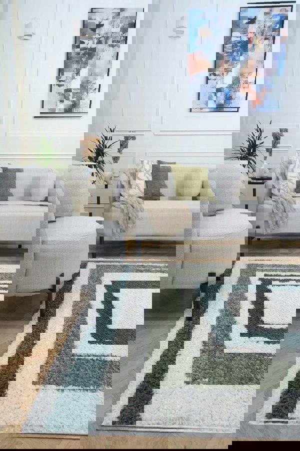 Bring cosy texture and classic style to your home with the Moodi Shaggy Green Marina Rug. Its bordered design and plush 30 mm pile add warmth and definition, creating a soft, inviting foundation for any room.