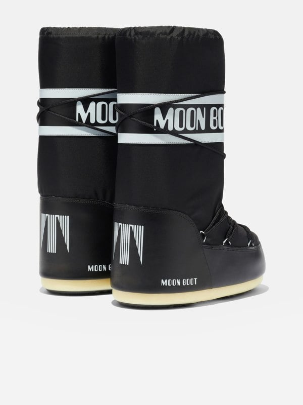Moon Boot Kids Icon Boots in black reinterpret the 1969 moon landing into updated Moon Boot footwear. This unisex snow-boot style pairs a water-repellent nylon outer with a foam lining, alongside a thermoplastic midsole and rubber tread sole. A PVC heel counter and trim add structure, while silver-tone metal eyelets and criss-cross tubular laces complete the distinctive look. An ambidextrous slip-on design keeps the silhouette simple, finished with a logo-print panel.