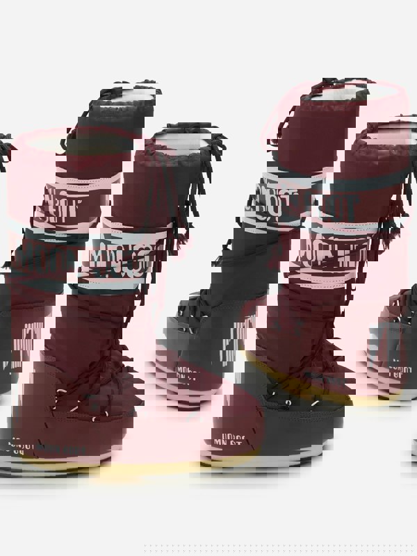Moon Boot Kids Icon Boots in maroon reinterpret the label’s iconic moon landing inspiration in a newly improved footwear style. This unisex snow boot pairs a water-repellent nylon outer with a foam lining, and finishes the look with a logo-print panel and silver-tone metal eyelets. An ambidextrous slip-on construction keeps the shape clean and practical, while criss-cross tubular laces add a distinctive, aesthetic detail.