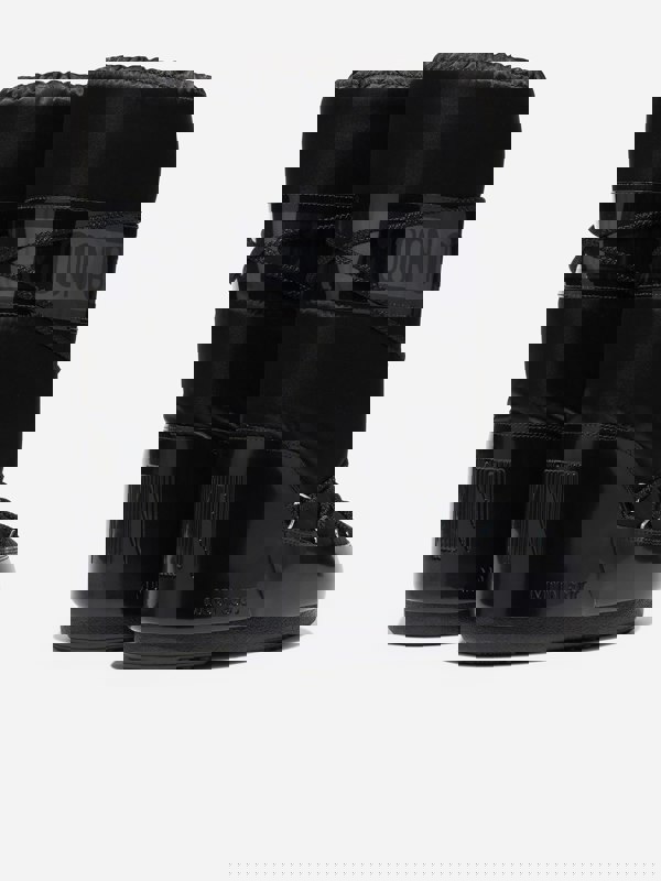 Moon Boot Kids Icon Glance Boots in black reinterpret the brand’s iconic moon landing inspiration in a newly updated style. The high upper uses synthetic material with a satin sheen finish, creating a distinctive look for cold-weather wear. A strap with the brand logo adds a clear signature detail, while long laces finished with tassels complete the design.