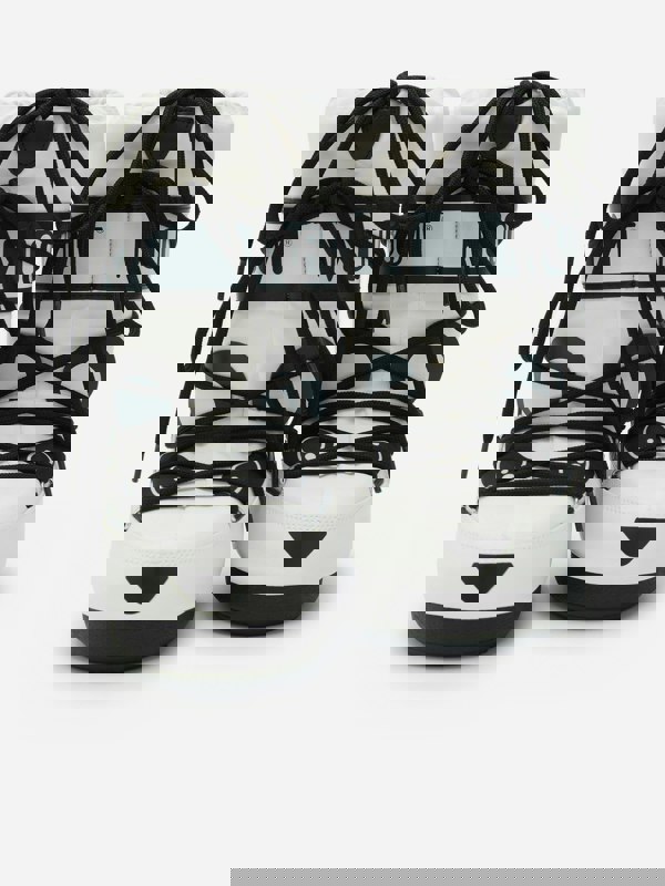 A black logo band sits at the top, matched with a black heel and black sole for a bold, graphic finish. Made from a polyamide and PVC blend, this pair keeps the focus on statement pattern and signature Moon Boot branding.