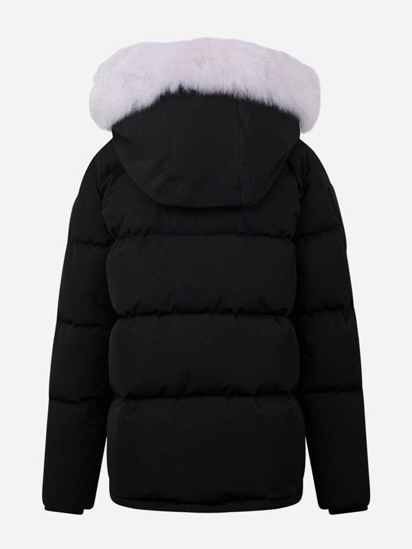 Moose Knuckles Kids 3Q Down Padded Puffer Jacket in black is a unisex bomber made in Canada. The outer combines 85% polyester and 15% cotton, with a 100% nylon lining and down padding for added insulation. A removable hood is finished with genuine sheep shearling trim, and a metal logo adds a branded detail.