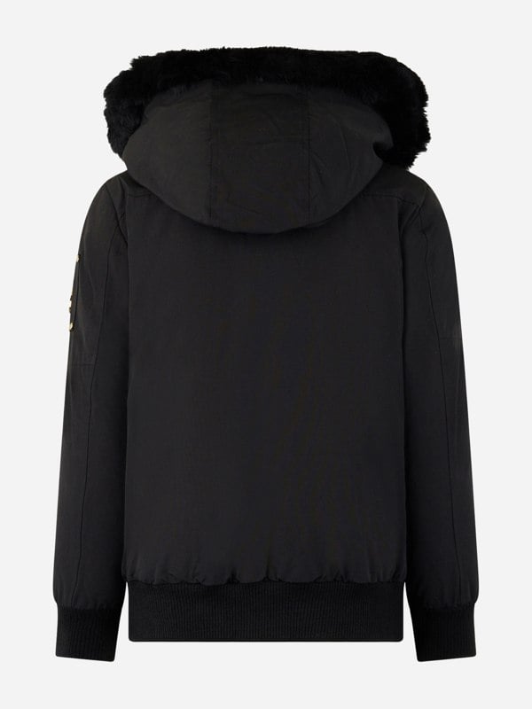 This unisex bomber jacket from Moose Knuckles Kids pairs a down-padded build with a sleek black finish. It comes with a protection rating of level 4 (Canada Cold) and 480 fill power, alongside a plush lined stand collar for added comfort. A snap-off hood with fox fur trim completes the outer, while the gold plated iconic metal logo adds a signature detail.