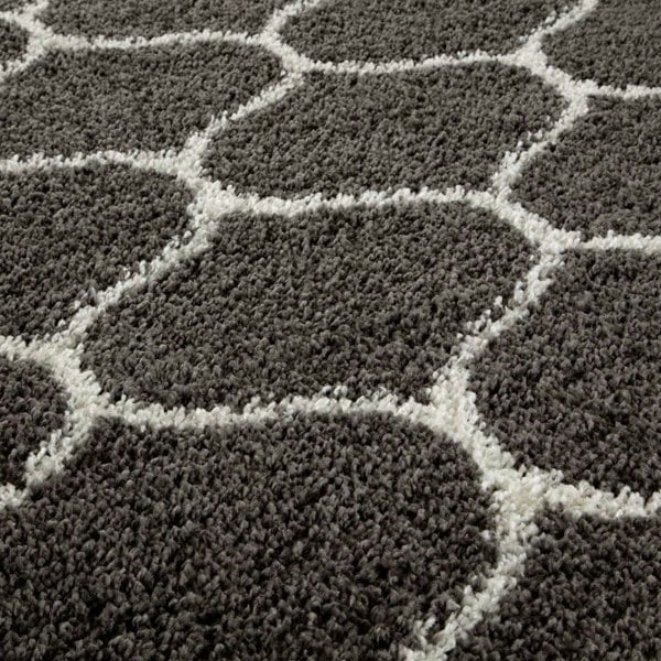 Bring warmth and texture to your home with the Moroccan Dark Grey Shaggy Rug. Its soft, dense pile provides a comfortable surface underfoot, while the subtle trellis-inspired design in rich dark grey adds a modern, understated elegance to any interior.