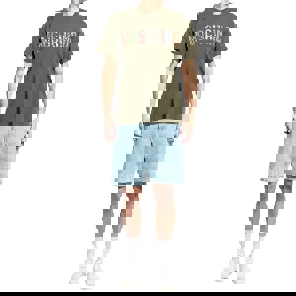 Elevate your casual wardrobe with the Moschino Bold Embroidered Multi Logo Green T-Shirt.