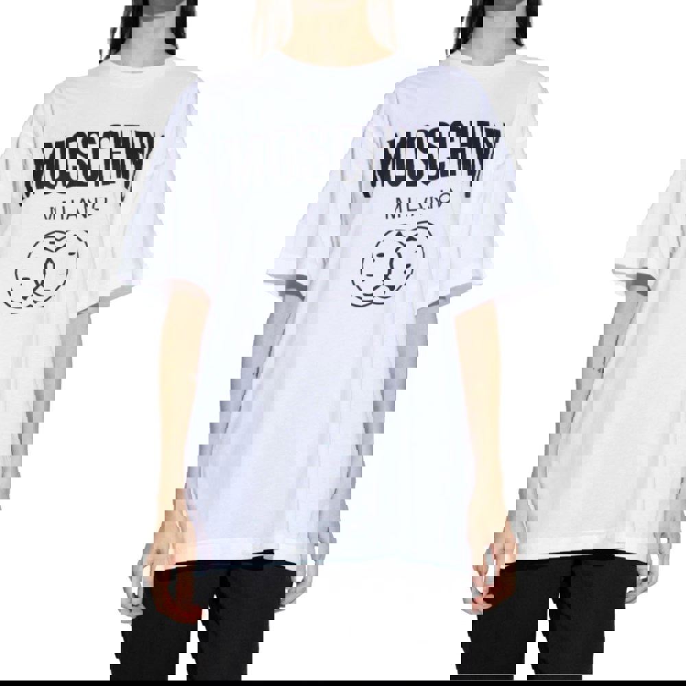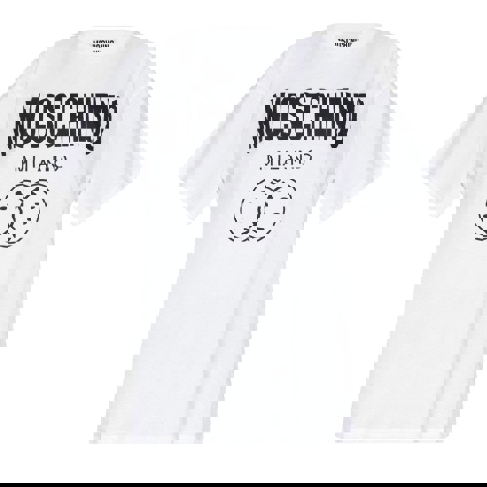 Crafted for comfort and style, this oversized tee features Moschino’s iconic double smiley graphic, adding a playful yet bold statement to your look.