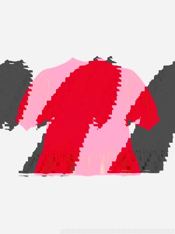 The silhouette includes long balloon sleeves and a flounced hem, with a classic crew neck and ribbed cuffs. Snap buttons at the back provide a practical fastening for dressing.