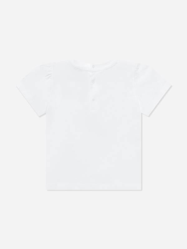 Moschino Kids baby girls T-shirt in white for SS2026. The front has a Moschino teddy bear print.