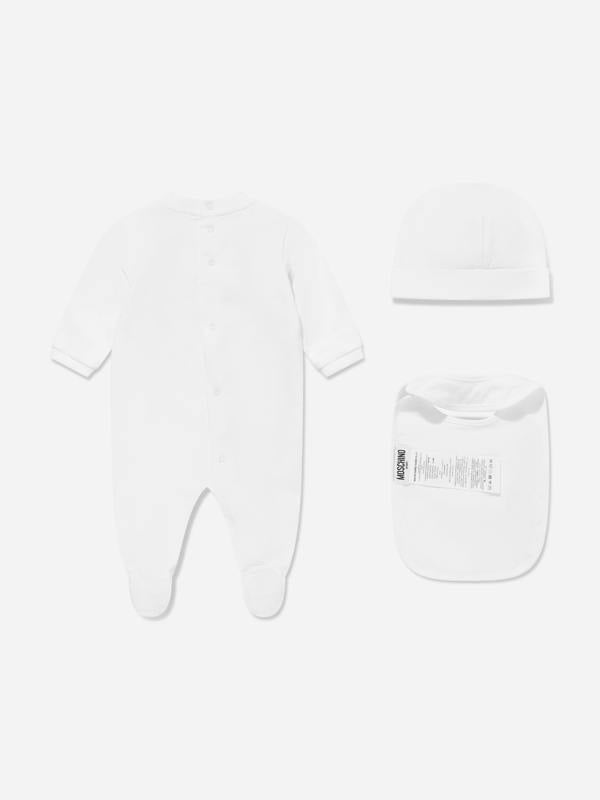 This Moschino Kids babygrow set in white brings the brand’s teddy bear motif to a coordinated three-piece outfit. The front is printed with a Teddy Bear graphic and logo, creating a clear signature look across the set.
