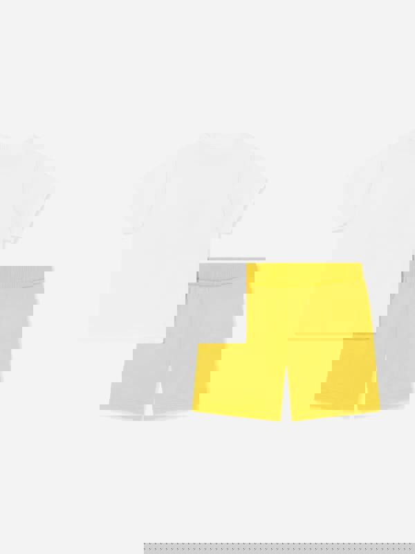 Moschino Kids Teddy Bear logo short set in yellow. A two-piece set with an iconic Teddy Bear motif and Moschino branding. The bright yellow colourway adds a bold look, with a soft material finish stated for comfort. Part of the SS2026 collection.