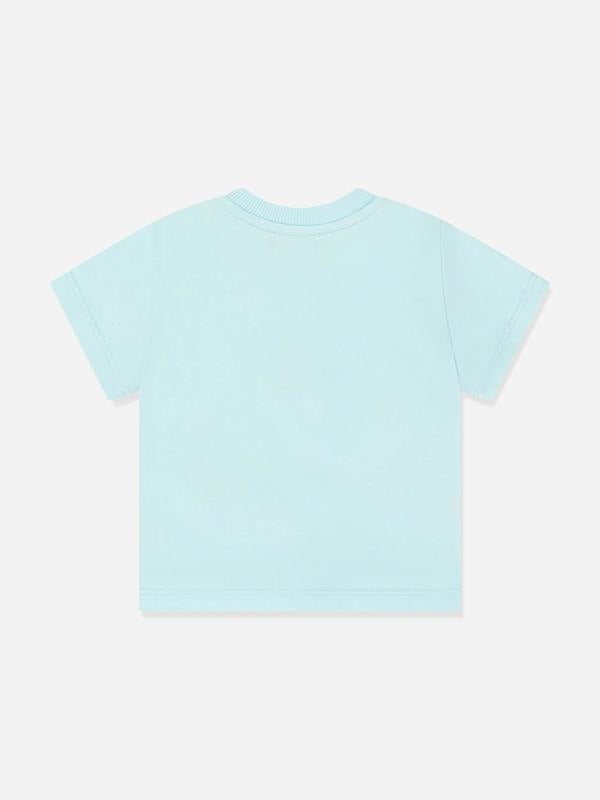 Moschino Kids Baby Teddy Bear T-Shirt in blue for the SS2026 season. The front has a Moschino teddy bear print, bringing a signature house motif to a simple everyday shape.