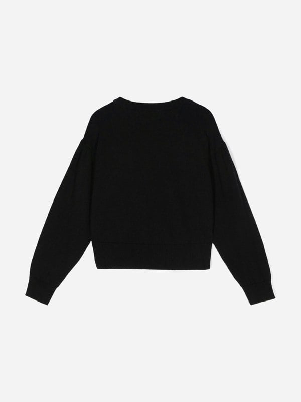 This girls’ black jumper brings a signature Moschino Kids detail to a clean, contemporary silhouette. The design includes a teddy bear motif presented as a heart badge, adding a distinctive branded finish. Ribbed trims at the waist and wrists create a neat outline, while the cotton and wool blend keeps the composition clear and simple.