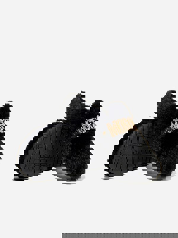 Moschino Kids faux fur logo slippers in black. Made in Italy, this designer pair combines a plush faux fur finish with a prominent Moschino logo for a bold, branded look.