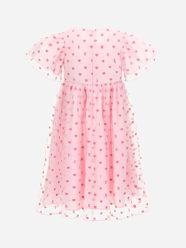 This Moschino Kids girls dress comes in pink with an all-over hearts motif in pink and gold. Subtle Moschino printing runs through the design, adding a branded finish. The silhouette is completed with draped short sleeves for a soft, fluid look.