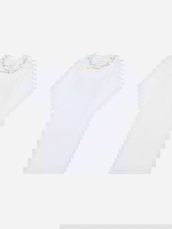 This Moschino Kids short sleeve T-shirt for girls comes in white with a printed design on the front. The graphic shows an Italian croissant alongside the Moschino logo, bringing a bold, playful look to a simple everyday staple. Made from 100% cotton, it has a ribbed crew neck and short sleeves for a classic finish.
