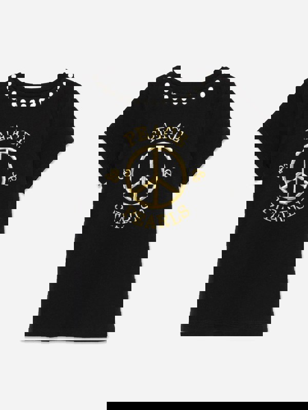 Moschino Kids Peace Pearls T-shirt in black for girls, part of the AW2024 collection. The design combines playful prints with pearl embellishment, bringing a distinctive Moschino look to a simple wardrobe staple. The black colourway keeps the finish clean and versatile, while the added pearls introduce a decorative detail.