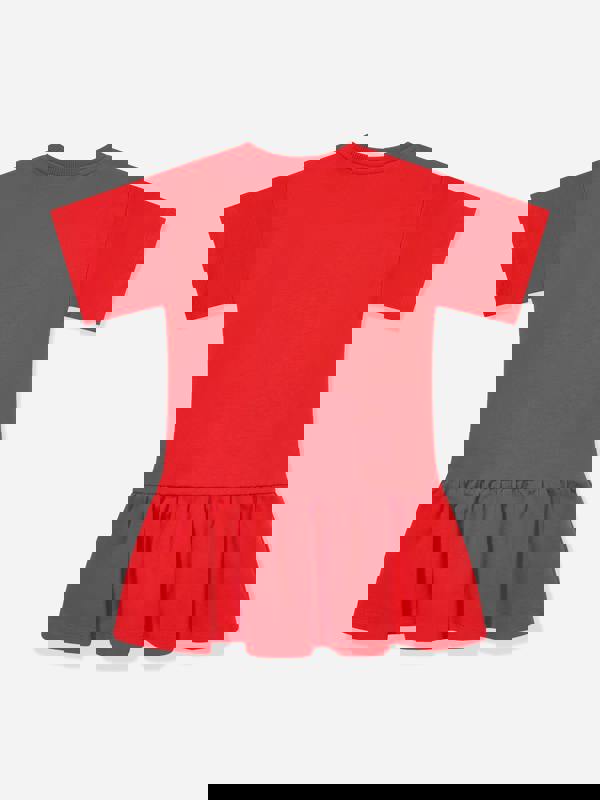 Moschino Kids brings a bold look to everyday dressing with this girls skater dress in poppy red. It has a round neck and short sleeves for a clean, simple finish, while the ruffle hem adds movement to the skirt. A teddy bear entwined within the ‘Moschino’ print sits as the main graphic detail, keeping the focus on the brand’s playful identity.