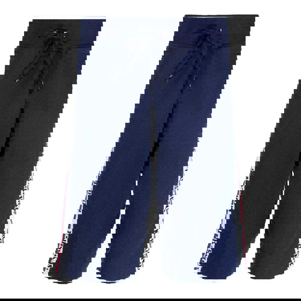 Moschino men’s shorts in navy blue with a logo design and branded tape detailing. The waistband is elasticated with an adjustable drawstring for a secure, flexible feel. A taped leg finish adds a clean, graphic look, while the stretch fabric supports comfortable everyday wear.