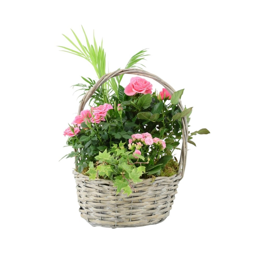 Place the planted basket in a location that receives adequate sunlight for roses (typically at least 6 hours a day if placed outdoors). Water regularly, keeping the soil consistently moist but not waterlogged. Ensure the basket has drainage to prevent root rot. Depending on the rose variety included, you may wish to deadhead spent blooms to encourage further flowering.