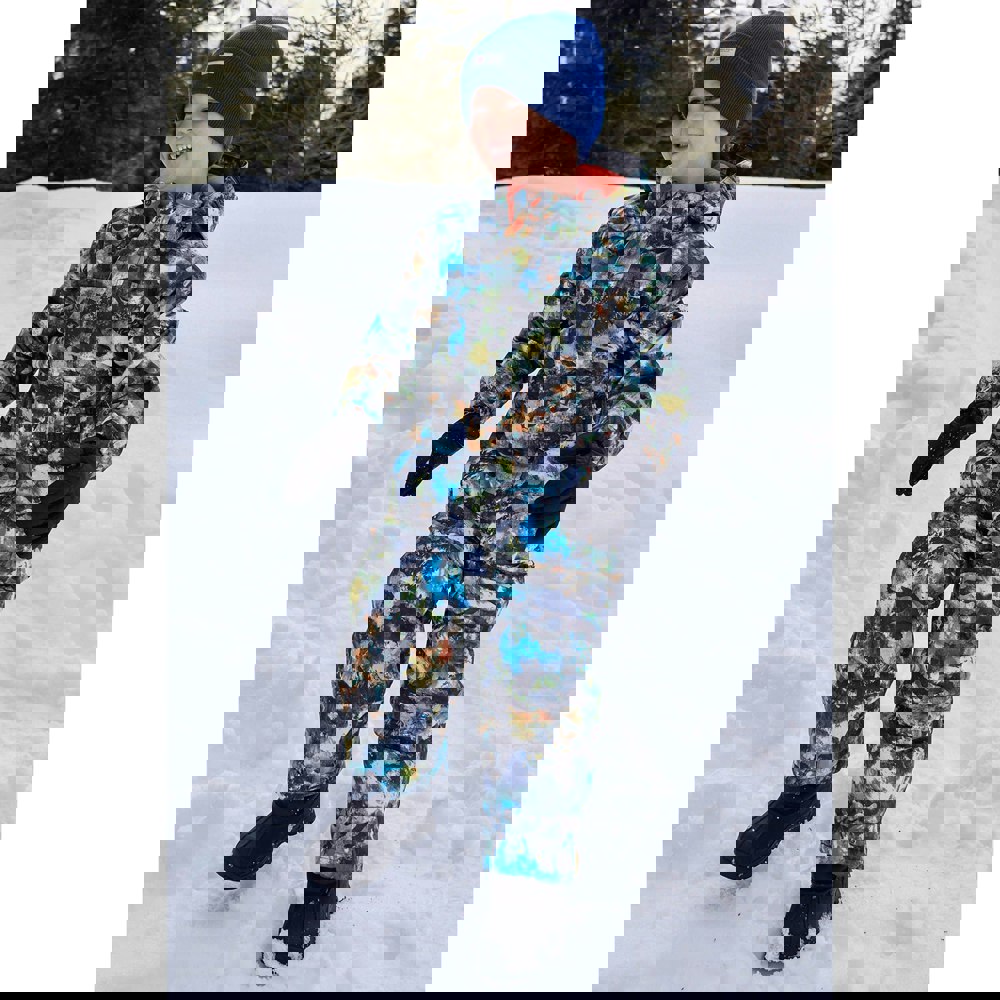 This children’s all-in-one snowsuit from Mountain Warehouse comes in dark khaki with an all-over cloud print. The outer is made from 100% polyamide, with a 100% polyester lining and 100% polyester filling. A fleece fabric finish is stated, alongside a hooded neckline and long sleeves.