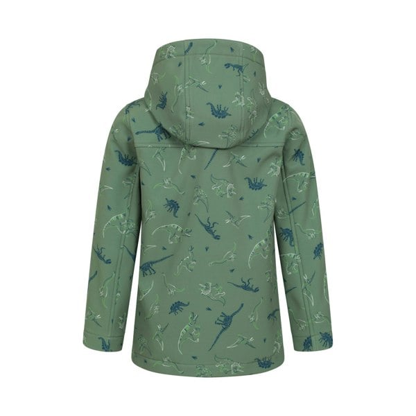 This children’s soft shell jacket is made from polyester and elastane, with a soft bonded fleece lining. It has an all-over dinosaur print and a hooded neckline with a grown-on hood. Long sleeves and a full zip fastening create a simple, practical finish, with a chin guard for added coverage at the top of the zip.
