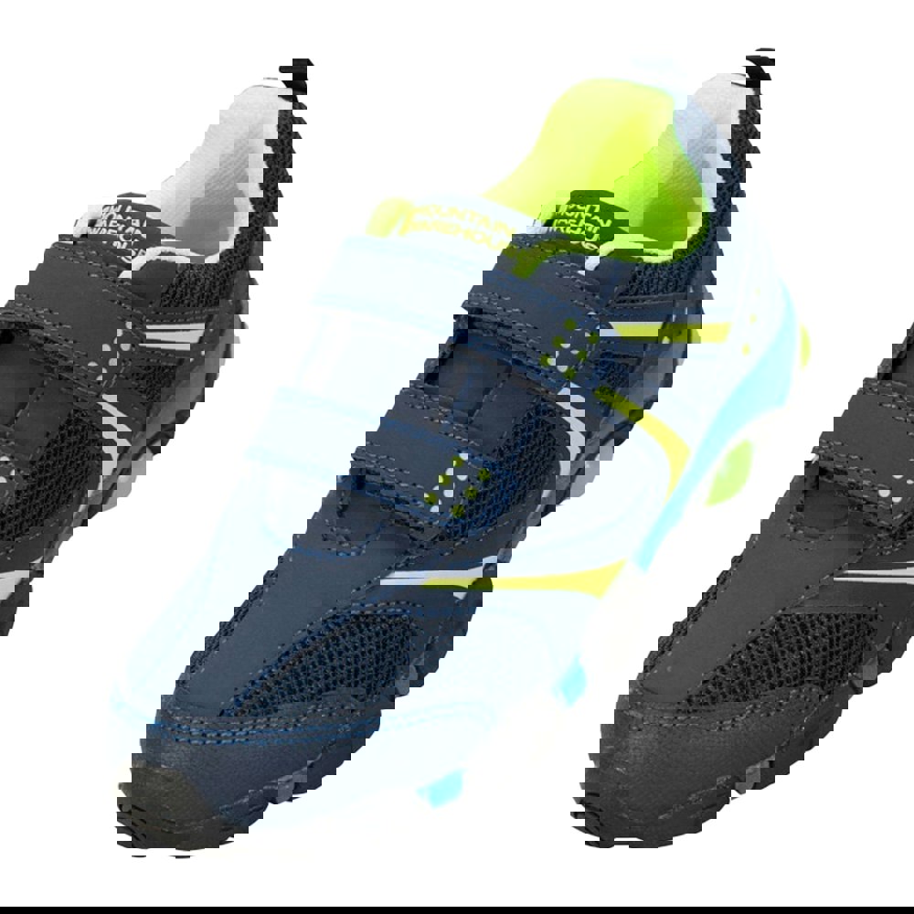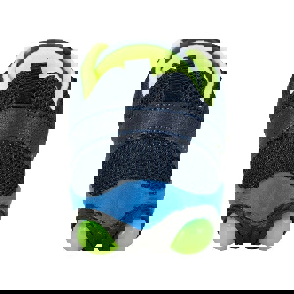 Finished in navy and lime green, the design includes contrast detailing and a logo. A round toe with a textured toe bumper adds structure at the front, and a pull tab supports easier on and off. Underfoot, the flat sole is hardwearing, and a hook and loop strap provides a secure fastening.