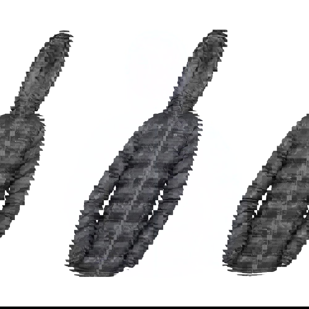This children’s padded jacket from Mountain Warehouse comes in black with a camouflage and logo design. Made from 100% polyester with an insulated microfibre filling, it uses lightweight fabric technology with a DWR finish, heat retention and water resistance.