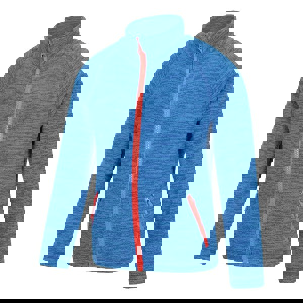 In blue with a heathered design and logo detail, it has long sleeves and a standing collar. A full zip fastening runs through the front, with a zip at the neckline for easy opening and closing. Two side pockets provide secure storage, each finished with a zip closure.