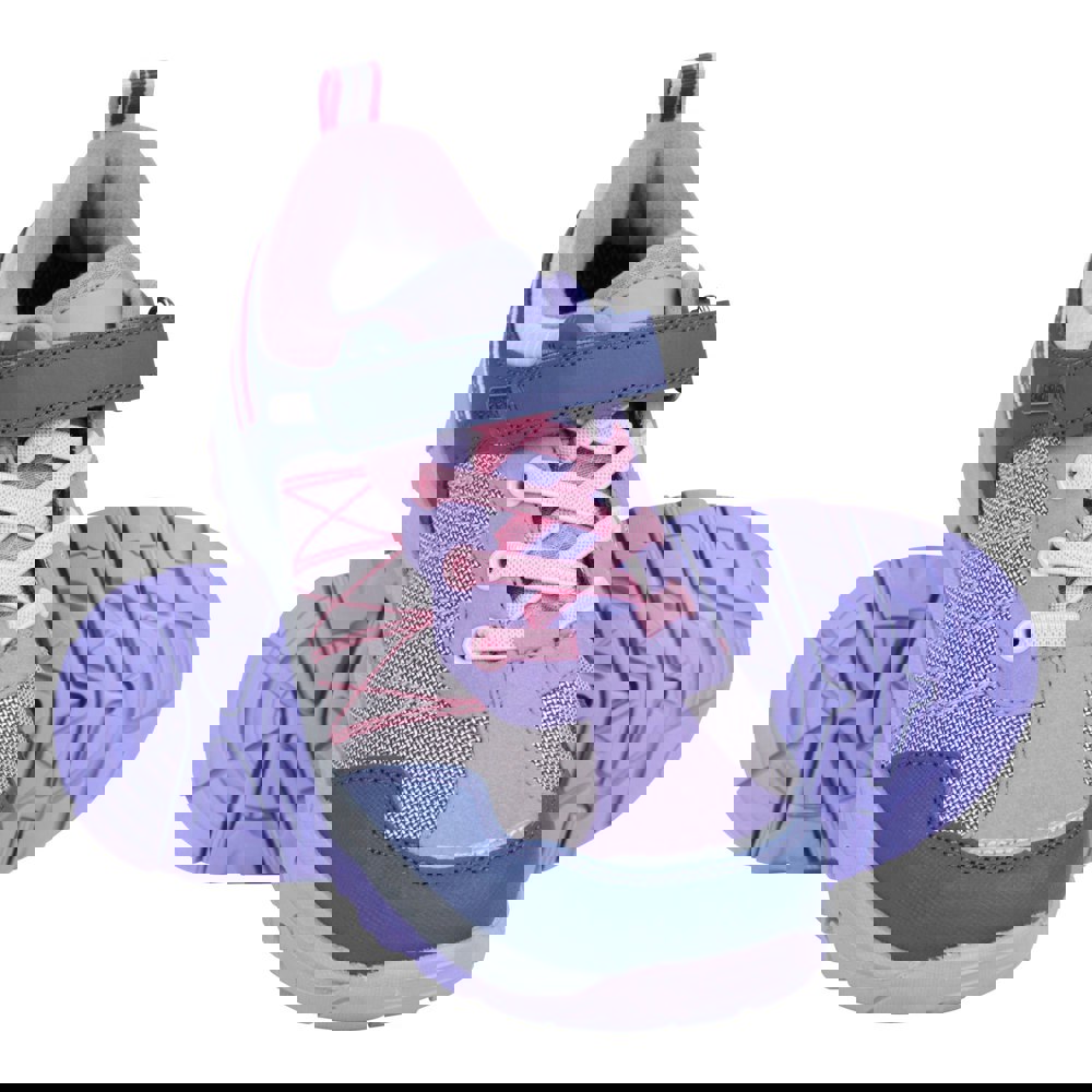 These children’s Stampede walking shoes from Mountain Warehouse come in lilac with a low-cut profile and a round toe. The upper combines durable mesh and synthetic materials with a water-resistant finish, supported by waterproof fabric technology. A contrast design is finished with logo and text detailing.