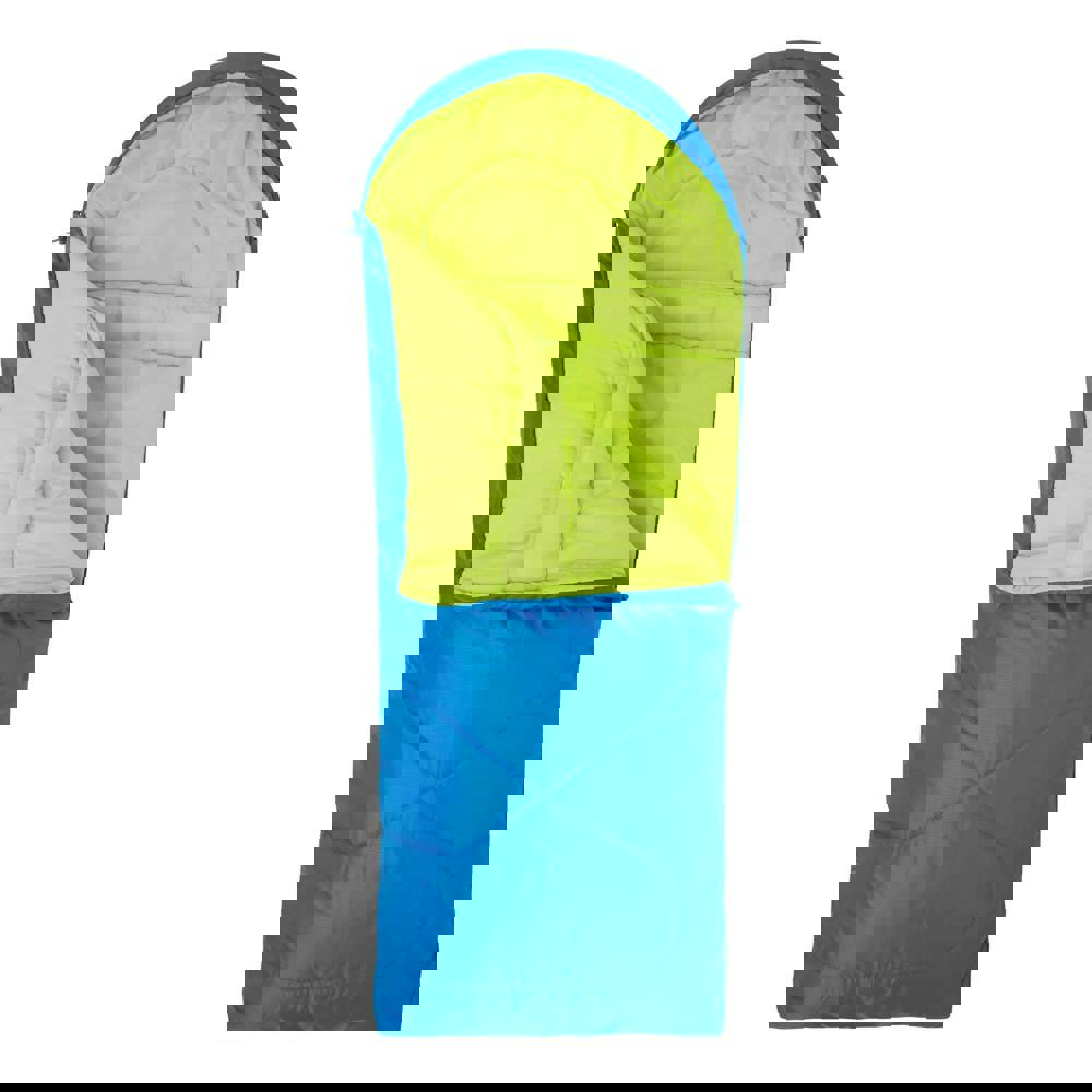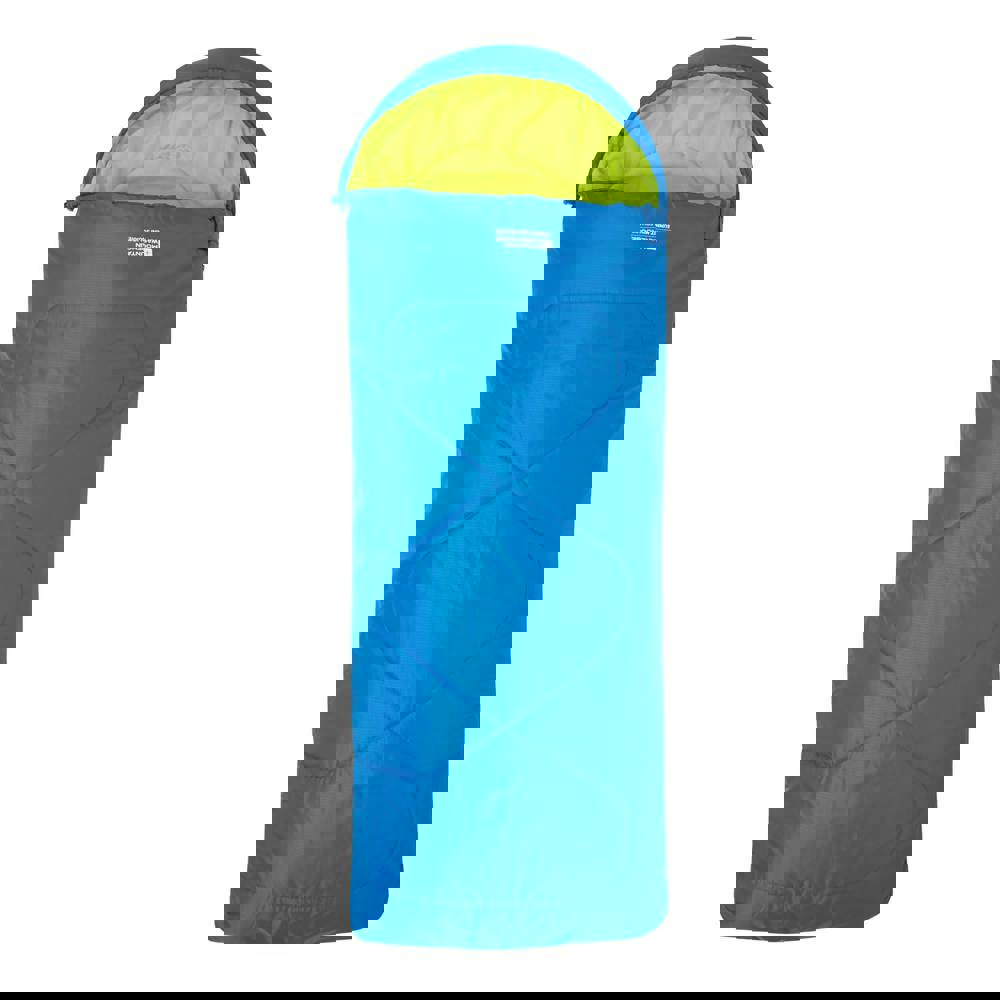 The Mountain Warehouse Childrens/Kids Summit Mini Sleeping Bag is designed for young campers, offering a compact mini shape with a two way zip fastening for easy opening and closing. Finished in blue with contrast detailing, it features an envelope-style design with square styling elements.