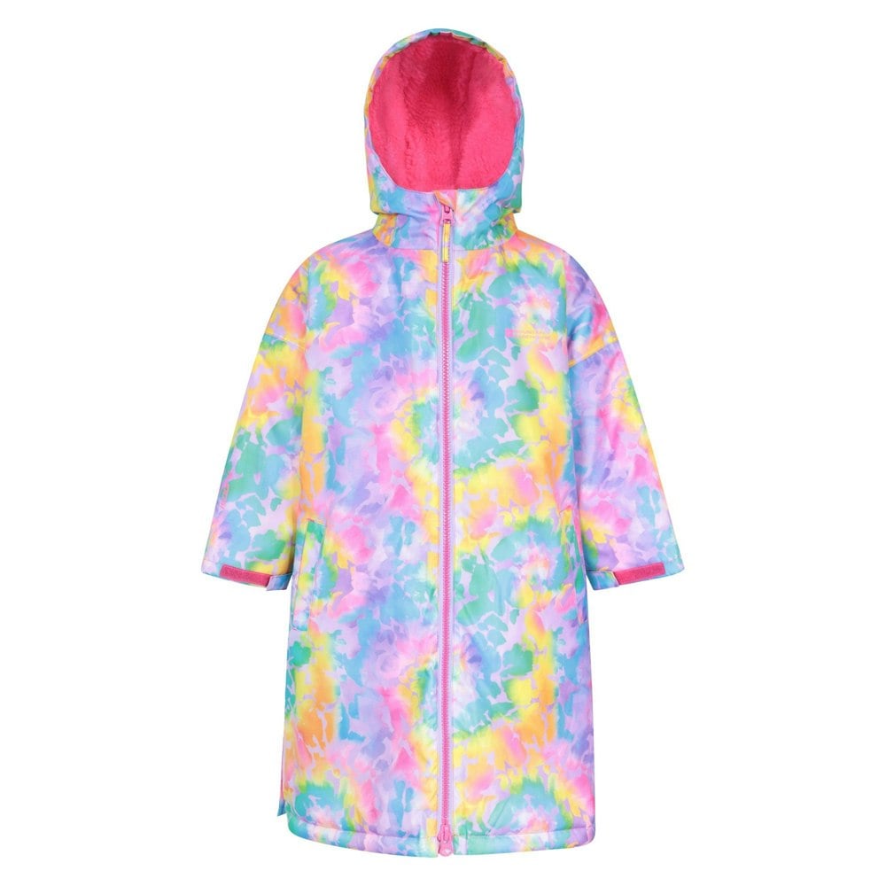 Made from 100% polyester, this bright blue changing robe has a fleece lining and a tie dye logo design. It is hooded with a sew-on hood, long sleeves and a front zip fastening. Taped seams sit alongside waterproof and windproof fabric technology.