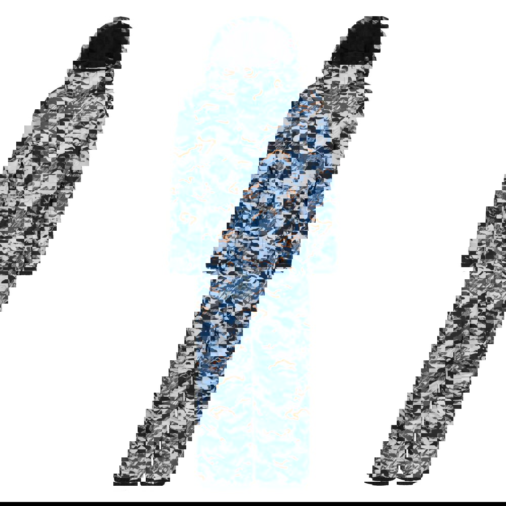 This kids all-in-one snowsuit from Mountain Warehouse comes in pale blue with an all-over cloud print. It has a hooded neckline and long sleeves, with stretch cuffs finished with a touch fastening tab. The waistline is elasticated and there are two side pockets.