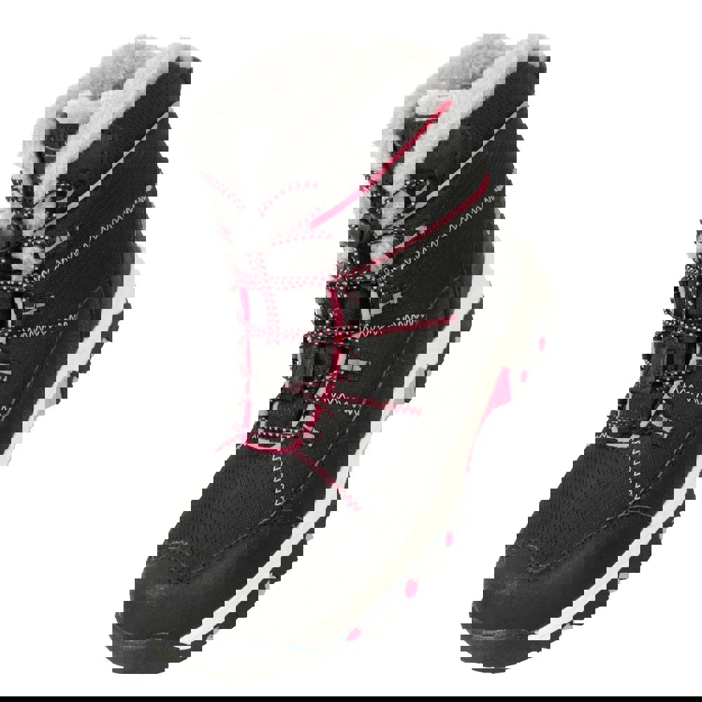 Mountain Warehouse Kids Comet Waterproof Snow Boots in black combine a synthetic and textile upper with a water resistant finish and a waterproof membrane. A faux fur lining and cushioned EVA insole sit inside a high-top cut, with an internal membrane liner and hydrophobic construction stated for added protection from wet conditions.