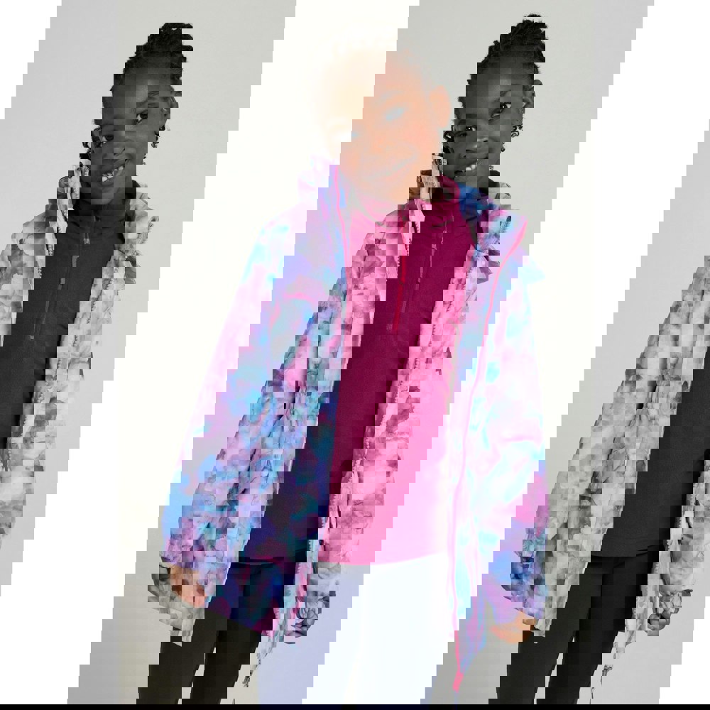 This kids’ waterproof jacket comes in purple with an all-over floral print and logo detailing. It has a hooded neckline with a 3 piece detachable hood, long sleeves and elasticated cuffs. An elasticated waistline adds a secure fit, while the full zip fastening is covered by a stormflap with stud and touch fastening.