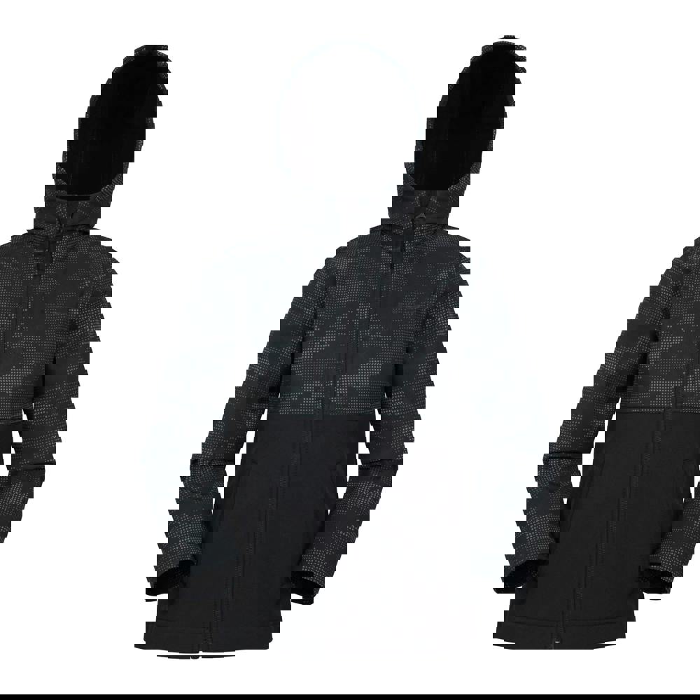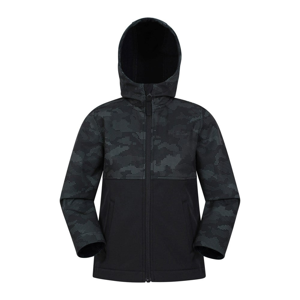 This kids softshell jacket comes in black with a camouflage and colour block design. The outer is made from 94% polyester and 6% elastane, with a 100% polyester lining. Softshell woven fabric construction sits alongside breathable, flexible and lightweight fabric technology, plus a showerproof, water resistant finish.