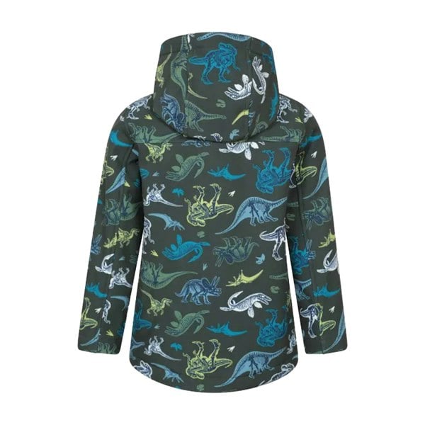 This kids soft shell jacket comes in dark green with an all-over dinosaur print. Made from bonded fleece, it has a hooded neckline and long sleeves. A full zip fastening runs through the front, finished with a chin guard.