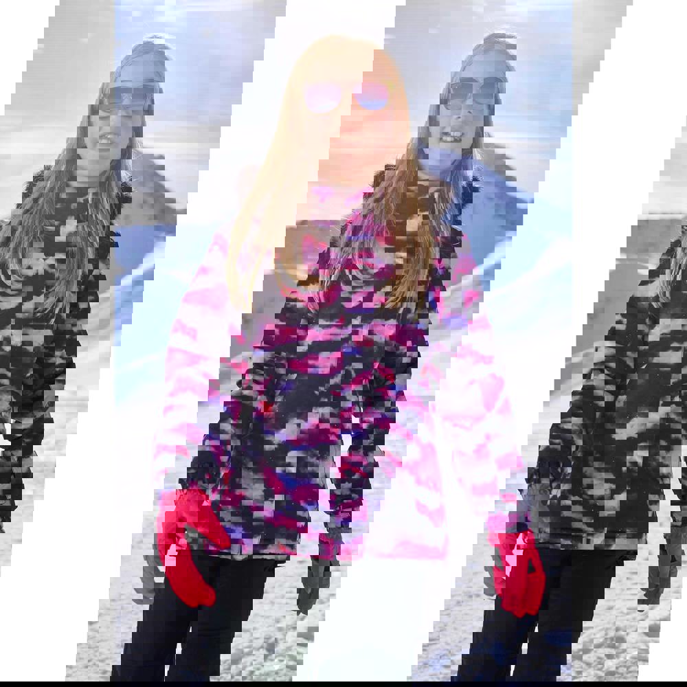 Mountain Warehouse Kids Glacial Floral Water Resistant Jacket in pink with a printed floral and logo design. The jacket has a soft fleece lining and microfibre filling, with fabric technology that includes a DWR finish, heat retention, PFC free construction and a waterproof rating of 3000mm. A hooded neckline is paired with a detachable hood and faux fur detail.
