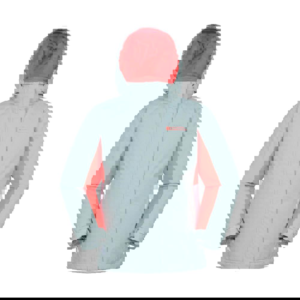 The Kids Honey Ski Jacket from Mountain Warehouse comes in pale green with a contrast logo design and a fleece lining. It has a hooded neckline with an adjustable grown on hood, plus long sleeves finished with elasticated cuffs and a touch fastening tab. Insulation and a snowskirt are included.
