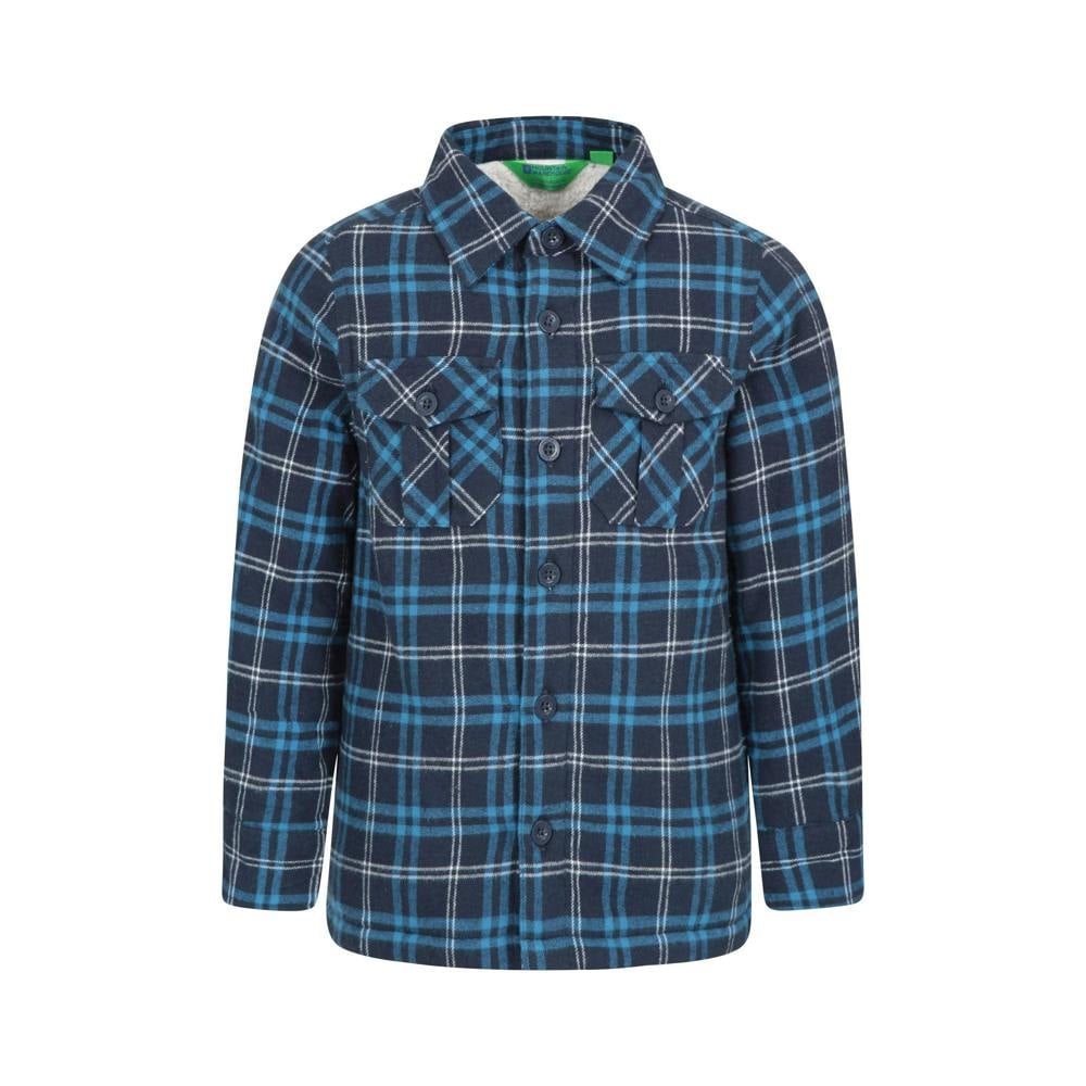 This kids’ Jackson shirt jacket from Mountain Warehouse comes in navy with a checked design. It has a shacket style cut with long sleeves and a turn down collar. A 6 button placket and button fastening keep the front neat and secure.