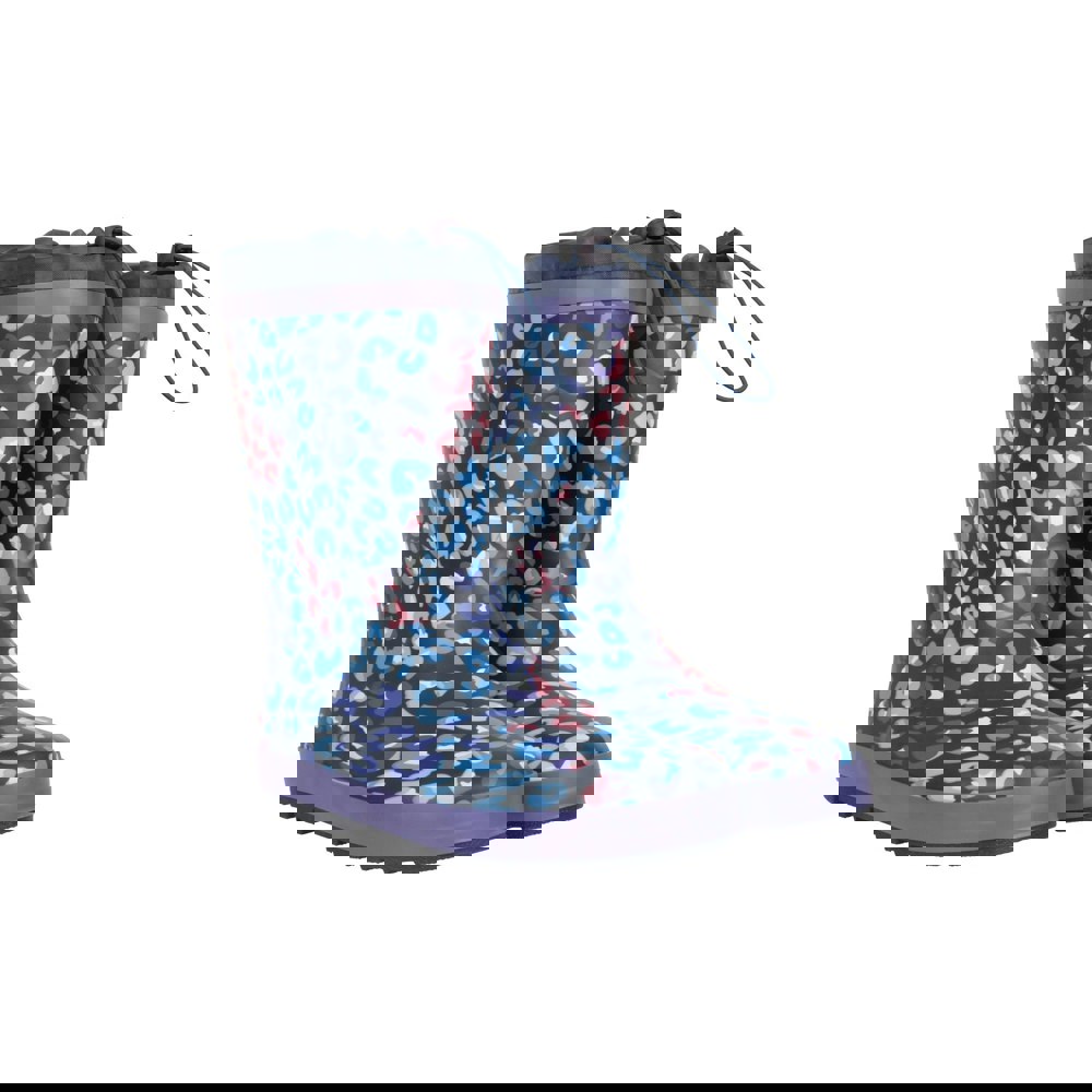 These kids’ winter wellington boots from Mountain Warehouse combine a bold leopard print with practical wet-weather construction. The synthetic upper is paired with a soft fleece and textile lining, while the calf-length cut offers extra coverage. A round toe keeps the shape classic, and the flat sole supports everyday wear.