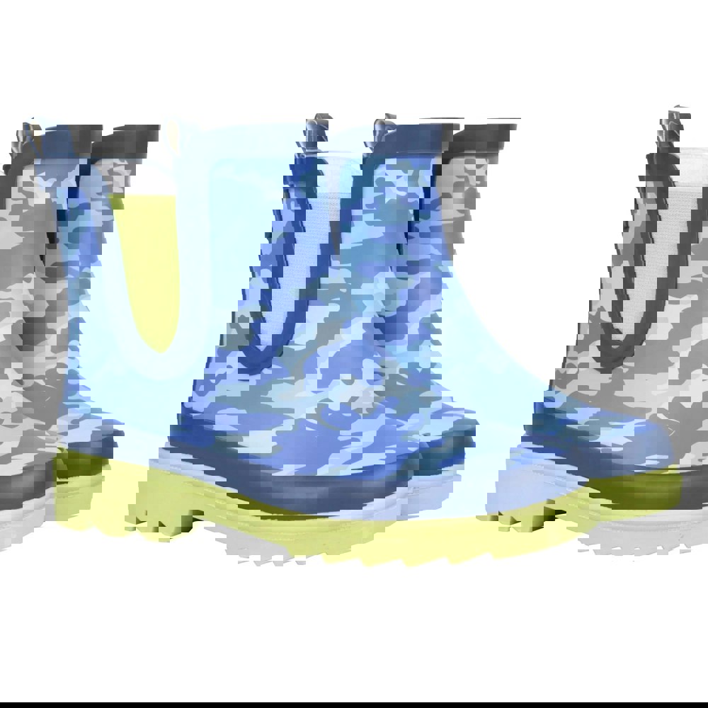 Mountain Warehouse Kids Lolly Camouflage Rubber Wellington Boots come in blue with a camouflage design and contrast detail. The upper combines rubber, synthetic and textile, with a textile lining and a foam insole. An ankle-high cut and round toe shape create a classic wellington profile, finished with a low heel.