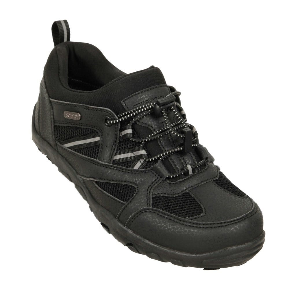 Mountain Warehouse Kids Meander Waterproof Walking Shoes in black combine a PU (polyurethane) upper with a mesh lining and a synthetic outsole. The low-cut profile has a flat sole and a round toe shape for a clean, practical finish.
