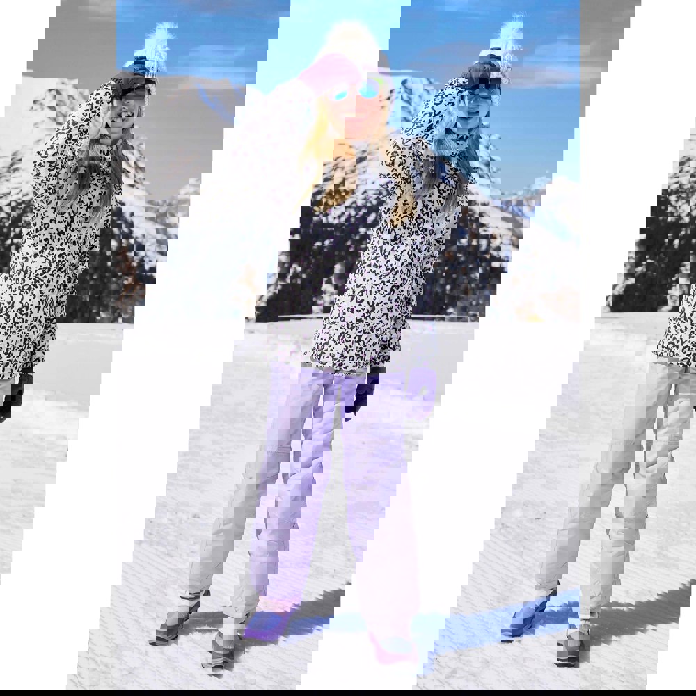 This kids’ printed ski jacket set comes in dark purple and includes trousers. The outer uses ripstop fabric with a snowproof finish and a logo print. Inside, the lining is fleece.